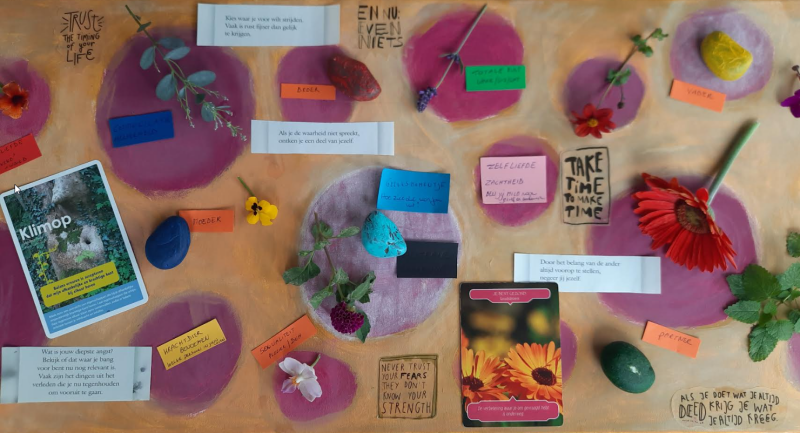 Natuurlijke materialen worden in een uniek jasje gestoken en gekoppeld aan fysieke en emotionele klachten. Via bloemen- , kruiden- en boomkaarten, kleuren kan er meer bewustwording plaatsvinden van bepaalde patronen en worden o.a. affirmaties, visualisaties, energetische oefeningen, meditaties en bloemen ingezet om over te gaan tot transformatie.